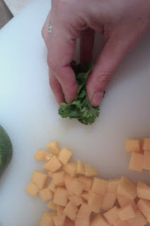 Since the pizza rounds were already prepared and I used leftover chicken I started with chopping up the mango, red bell pepper and cilantro.